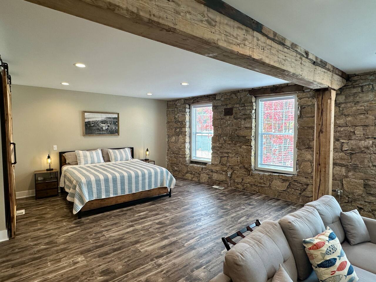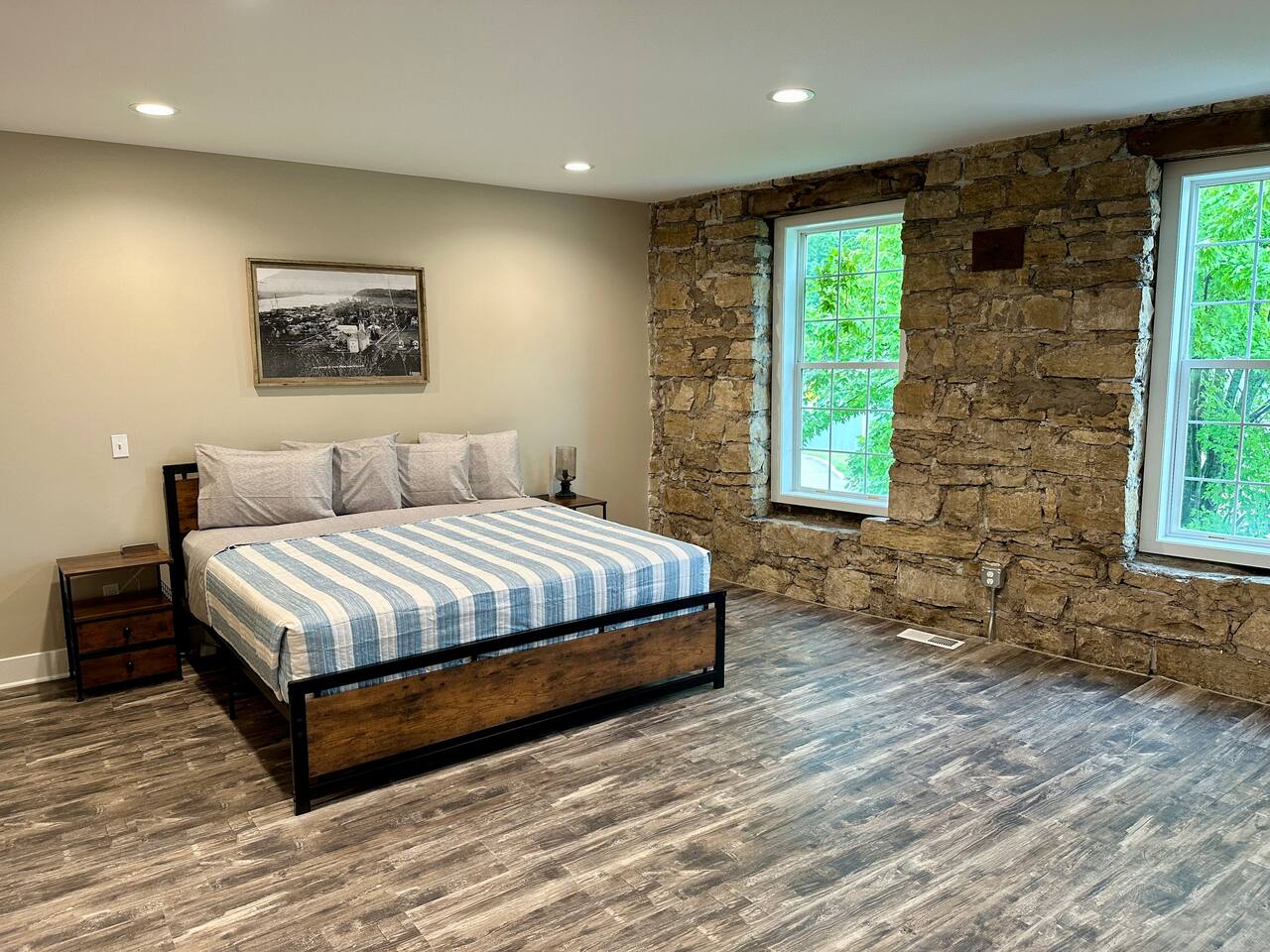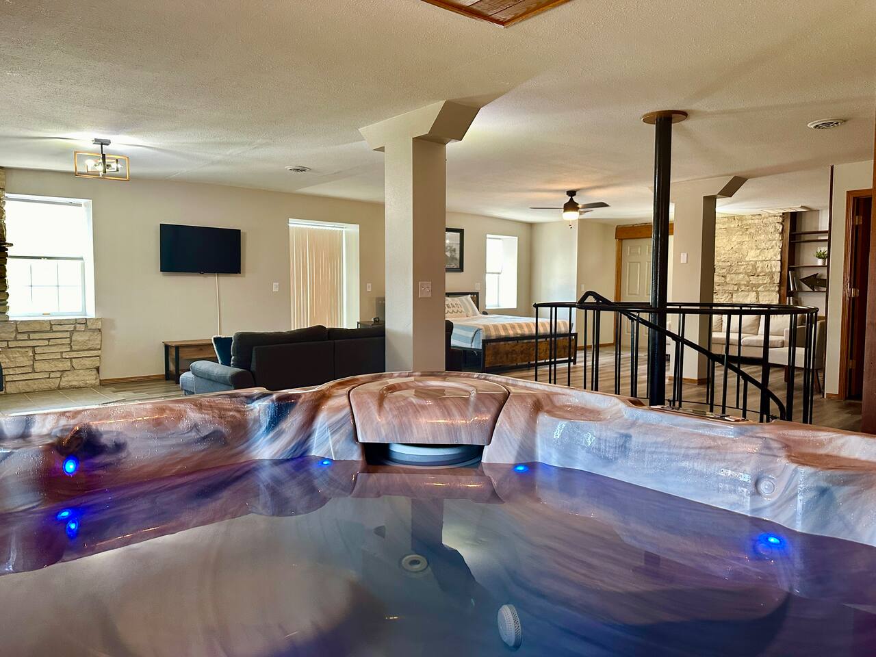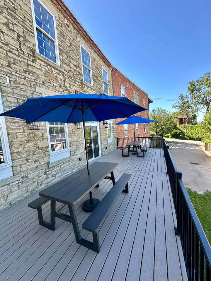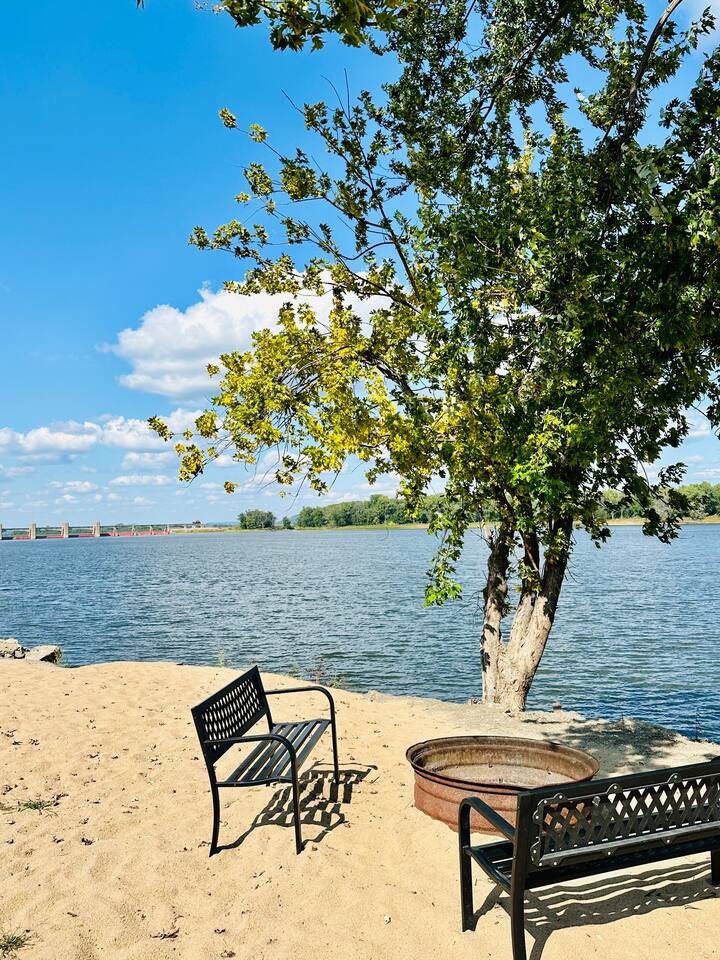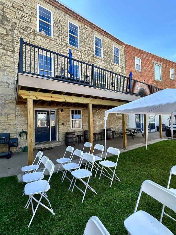 This unique & historic home has 7 bedrooms with 7 bathrooms including a 6 person indoor hot tub, two full kitchens and is steps from our resort’s private beach, boat ramp and docks; right on the Mississippi River. The River Rock Inn can be rented as an entire home or by separate Villas all connecting to a common lobby on each floor. There is a 30' deck overlooking the river which is perfect for special occasions or a picnic outside in the shade. (Renovations completed June 1, 2024) *This listing is for the entire building so you will have access to all bedrooms etc privately. There is no 24 hour staff or service.