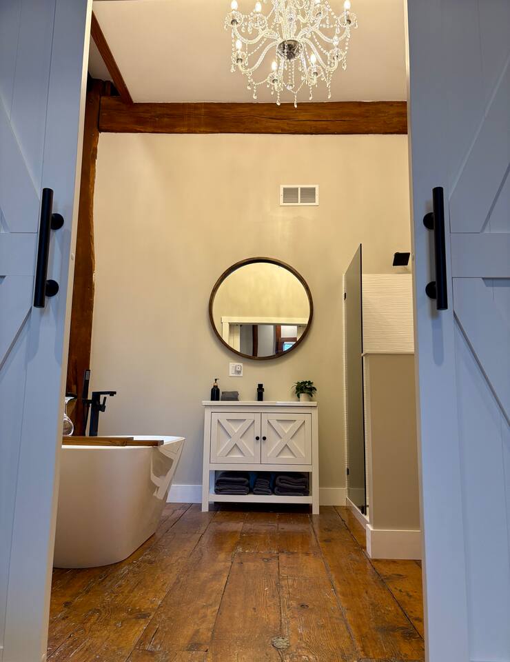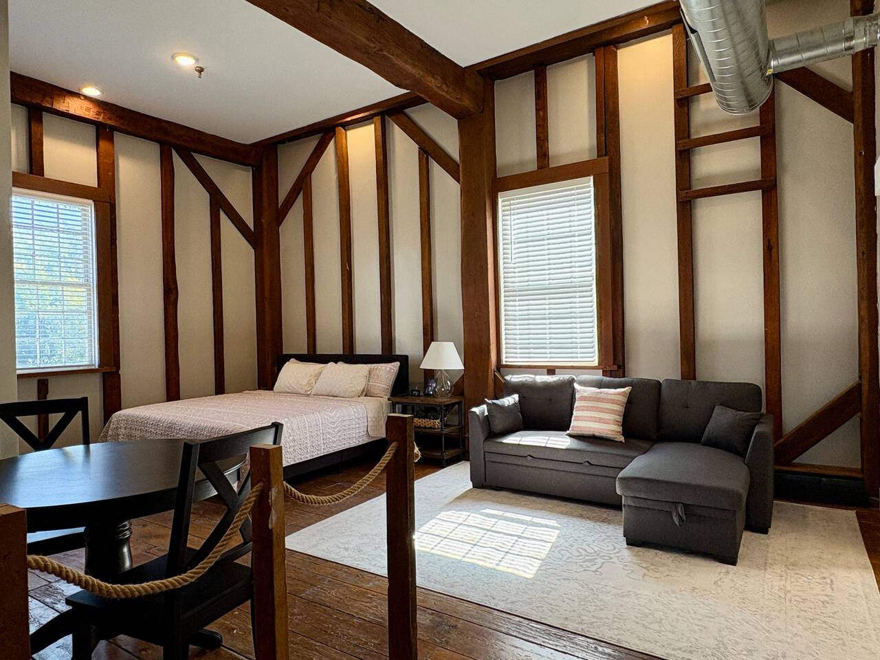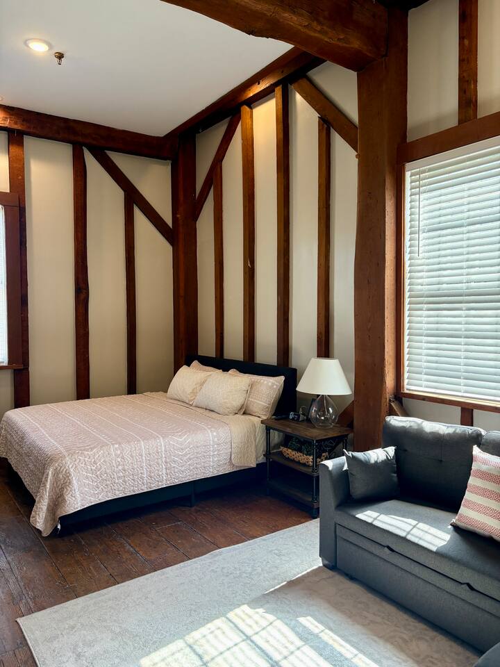 The Riverbend Suite blends rustic charm with modern comfort. Featuring exposed original timbers, high vaulted ceilings, and cozy, curated furnishings. This suite is a perfect hideaway for couples looking to escape the city and experience small town tranquility. This is also our bridal/honeymoon suite offering plenty of space to relax on the second floor of this historic mill. This suite has river views, large soaking tub, king bed and wet-bar.